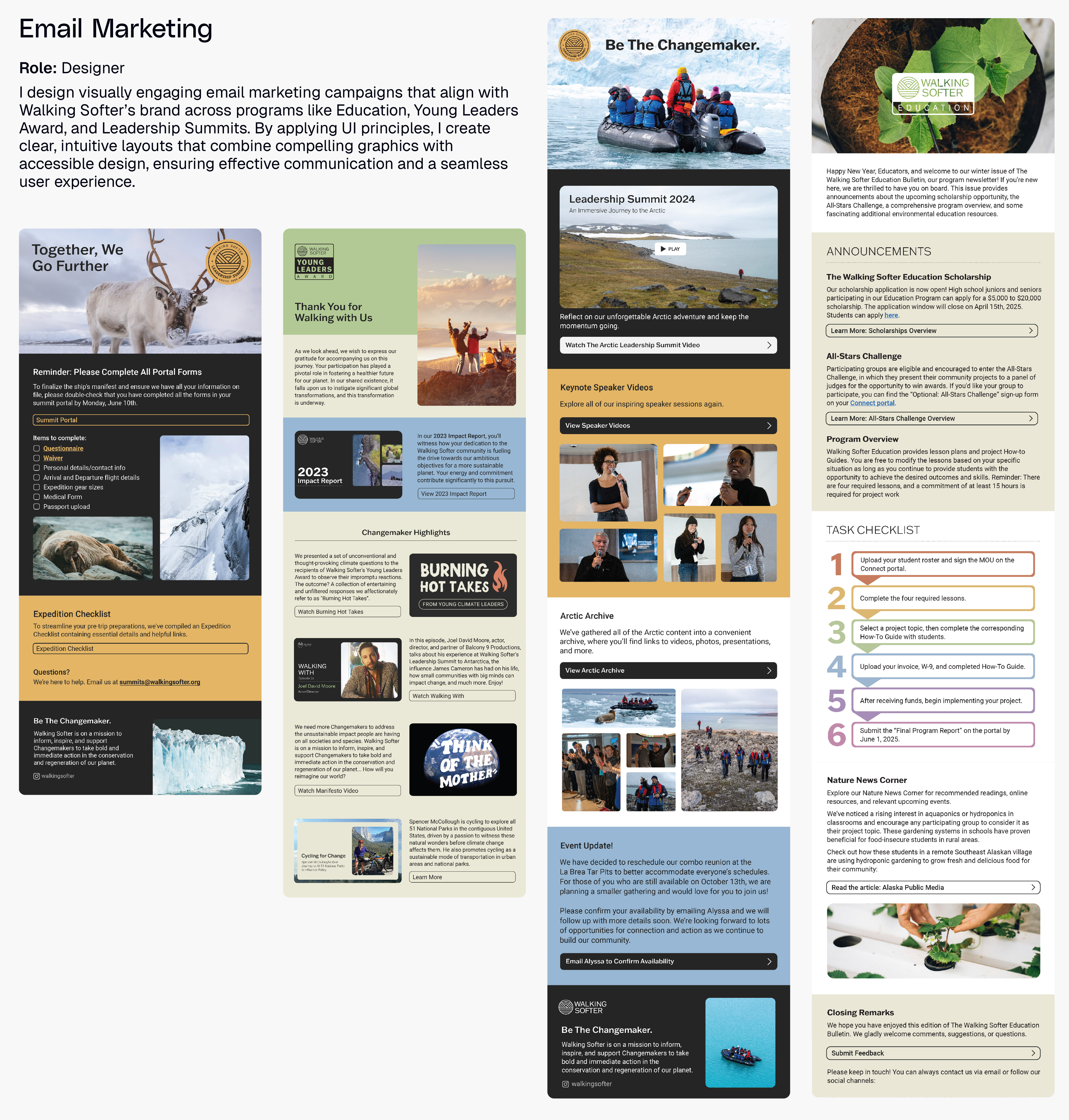 At Walking Softer, I contributed to the organization’s brand development through the design of key digital and print assets that enhanced its communication and engagement strategies. From creating two new subpages for the Education section to designing interactive impact reports, my work elevated Walking Softer’s visual identity and strengthened its connection with diverse audiences. By redesigning the Policy Partners page and collaborating on a full website audit, I helped shape a cohesive, user-focused brand experience across all touchpoints, laying the foundation for the organization’s digital evolution.